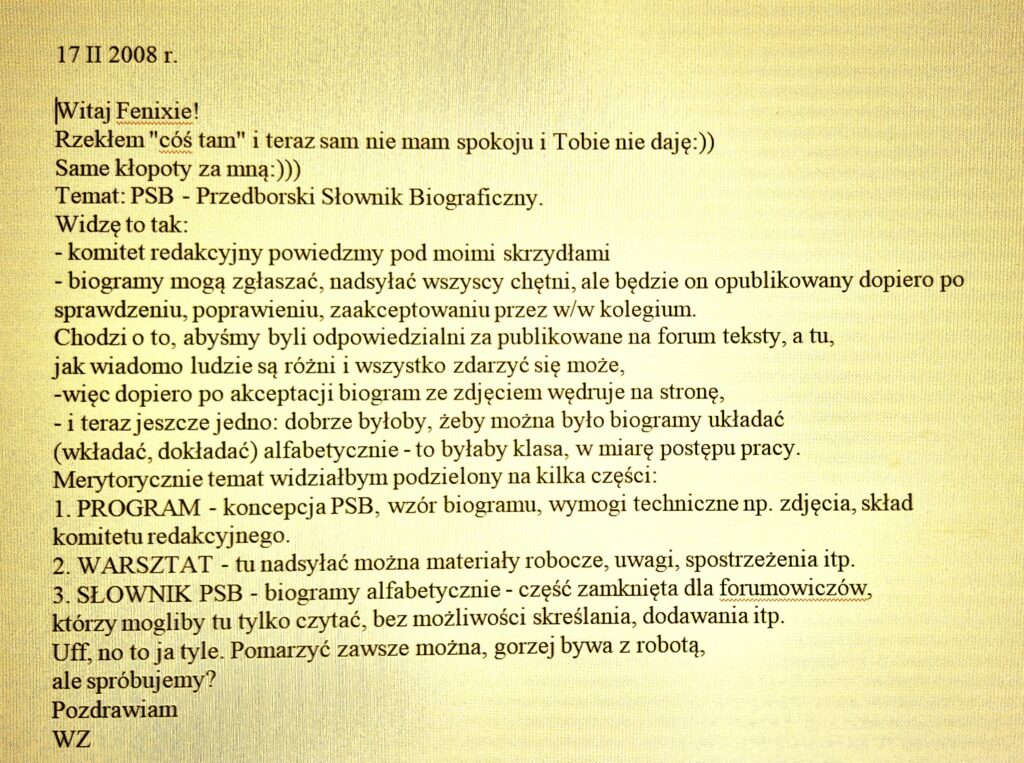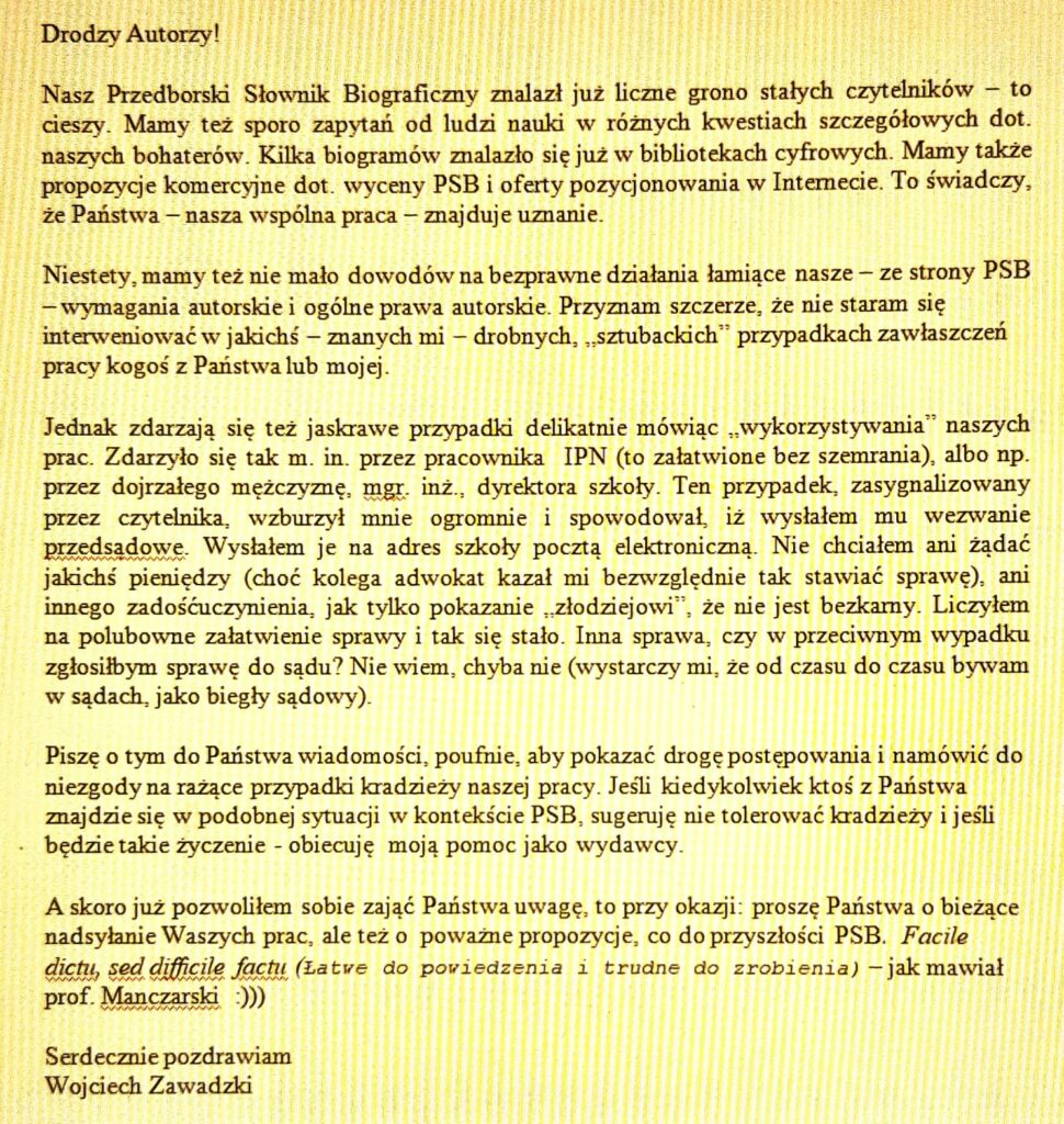 Jeśli Państwo akceptują takie rozwiązanie, uprzejmie proszę o nadesłanie mi swojej zgody na nieodpłatną publikację biogramów Waszego autorstwa w terminie do 11 listopada br. Bez tej zgody, prace danego Autora nie zostaną opublikowane. Po tym terminie oddaję do wydawnictwa skład pierwszego tomu. Wtedy też opublikuję w PSB wykaz biogramów tego tomu.